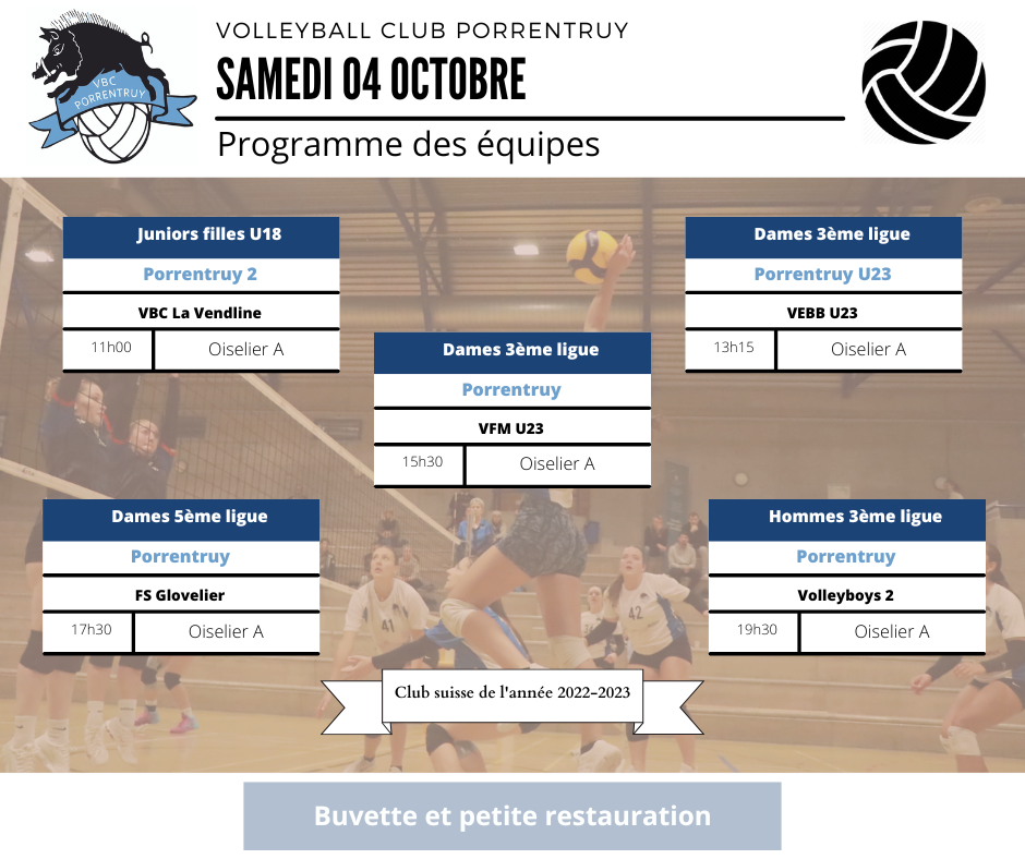 – à 15h30 : D3 – VBC Vendline et D5 – Volleyboys Bienne