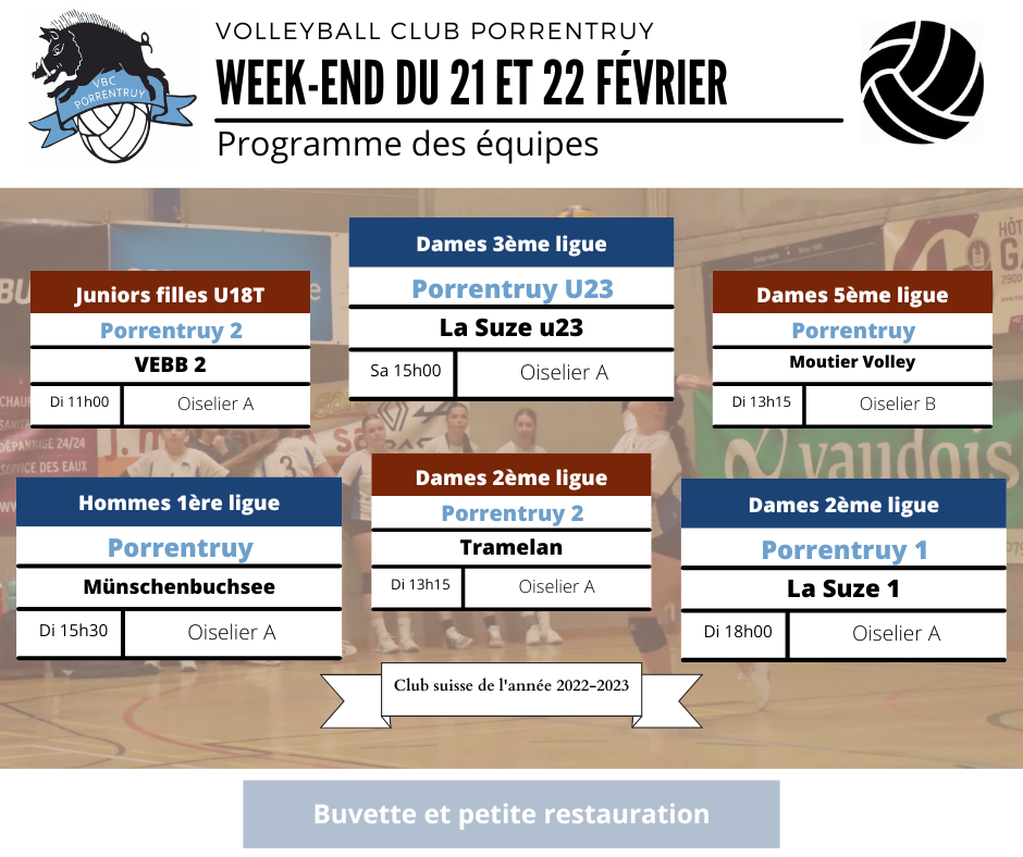 – à 13h15 : D2B – VBC Tramelan et D5 – Volley Moutier