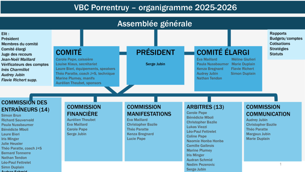 En 2025-2026, le VBC Porrentruy peut compter sur 14 entraîneurs en activité, dont les deux fidèles « pros » Simon Brun et Richard Sauvervald ; ainsi que 13 arbitres et 7 membres du comité. Belle preuve de vitalité et d’engagement pour le club.